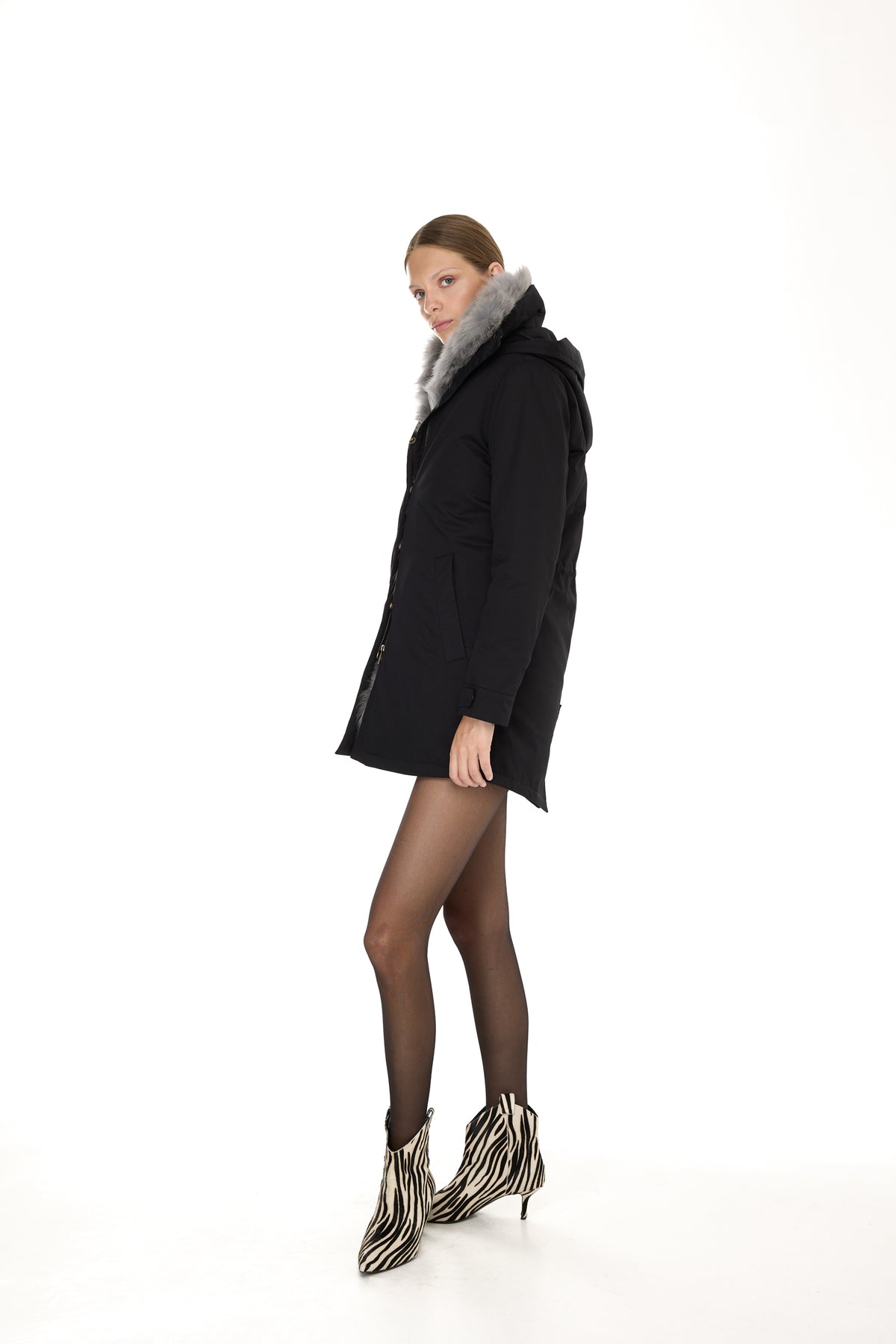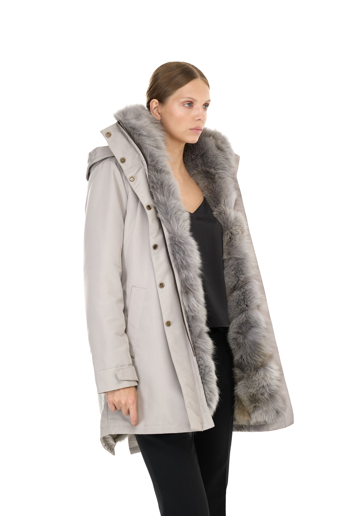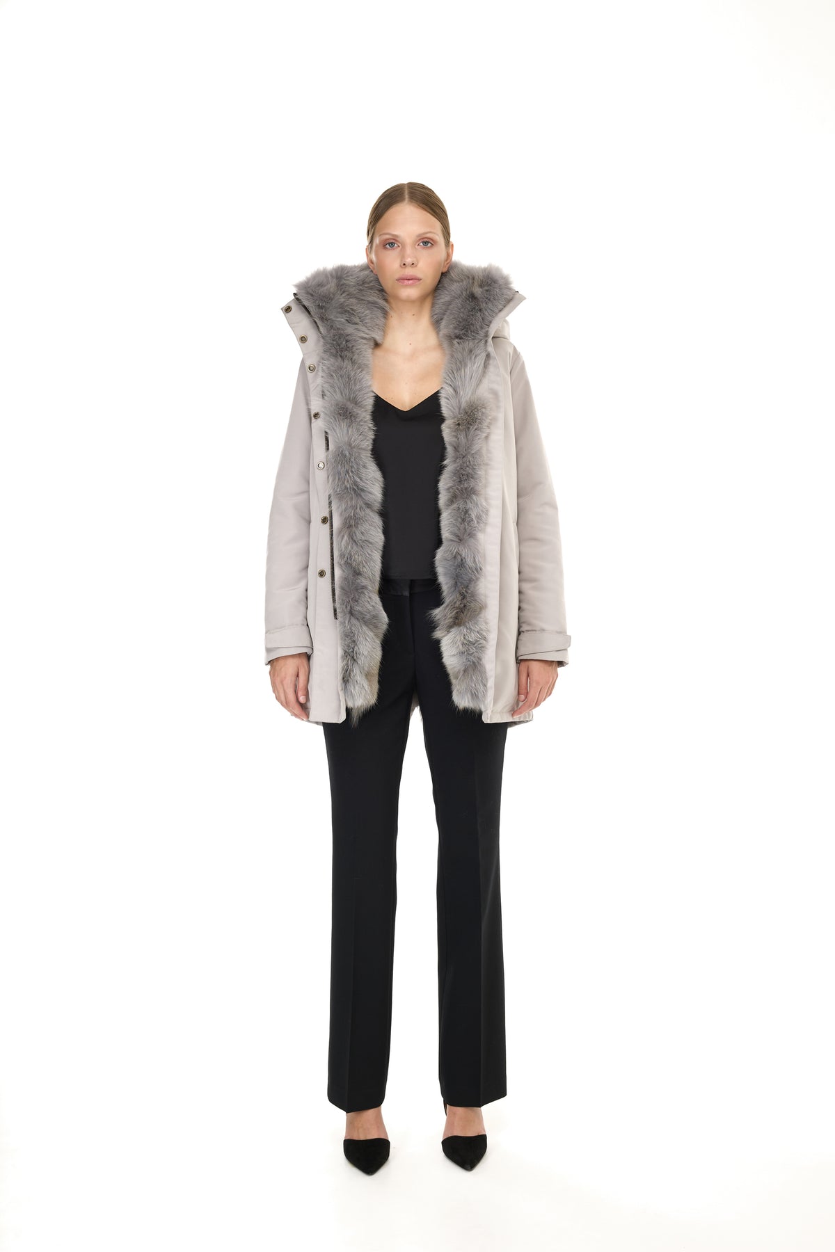 Quando la pelliccia viene rimossa, la parte esterna si trasforma in un parka leggero perfetto per la primavera e le serate estive, mantenendo la sua silhouette pulita e il taglio sofisticato.