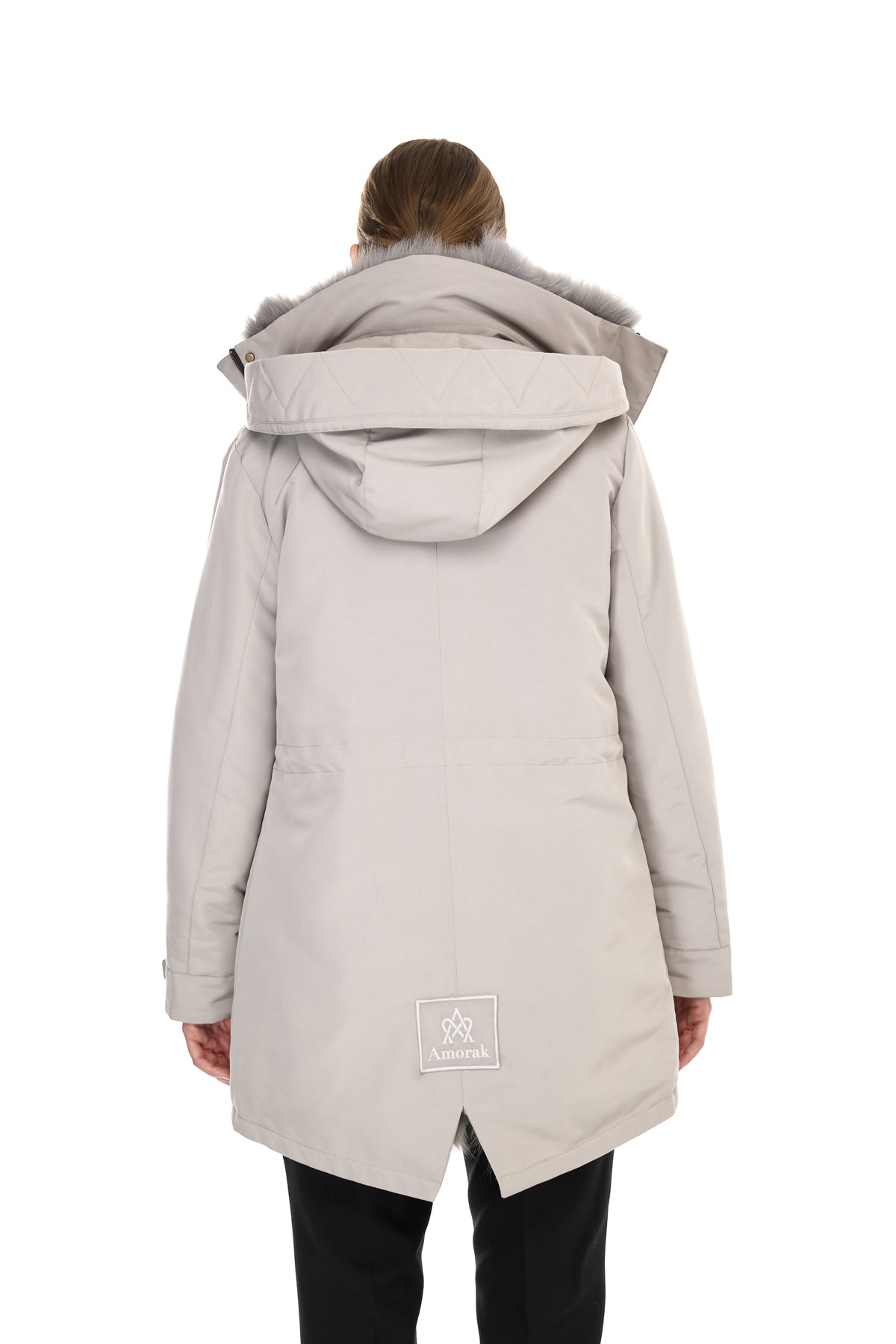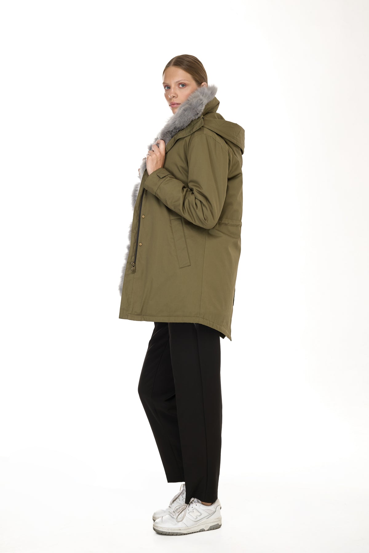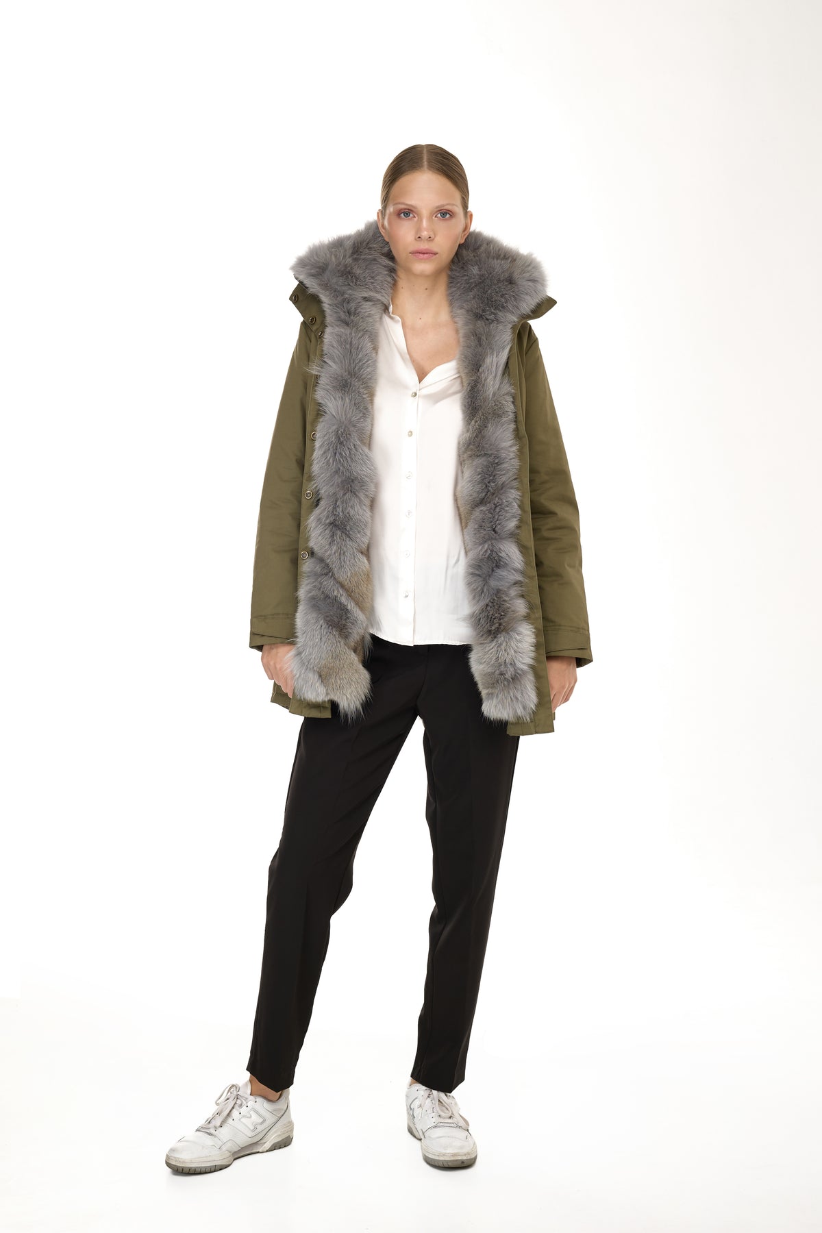 Quando la pelliccia viene rimossa, la parte esterna si trasforma in un parka leggero perfetto per la primavera e le serate estive, mantenendo la sua silhouette pulita e il taglio sofisticato.