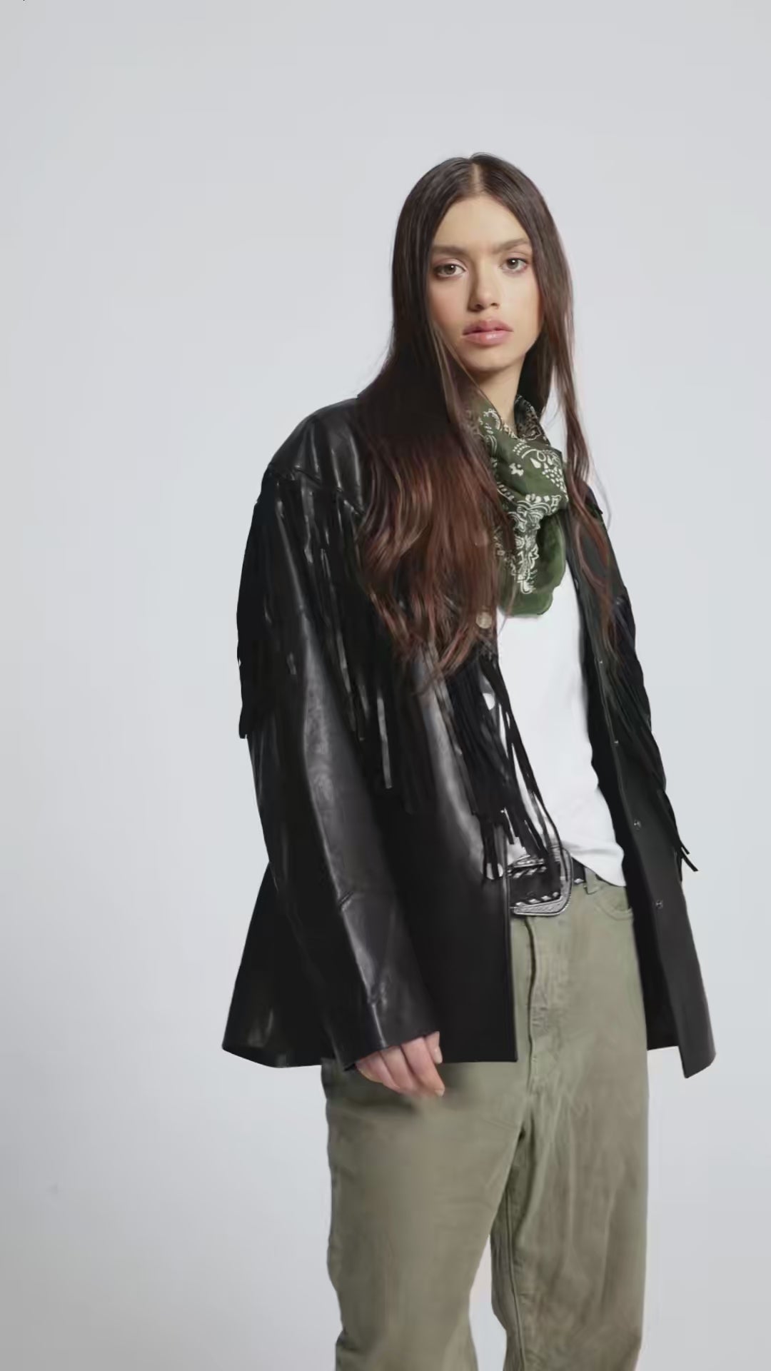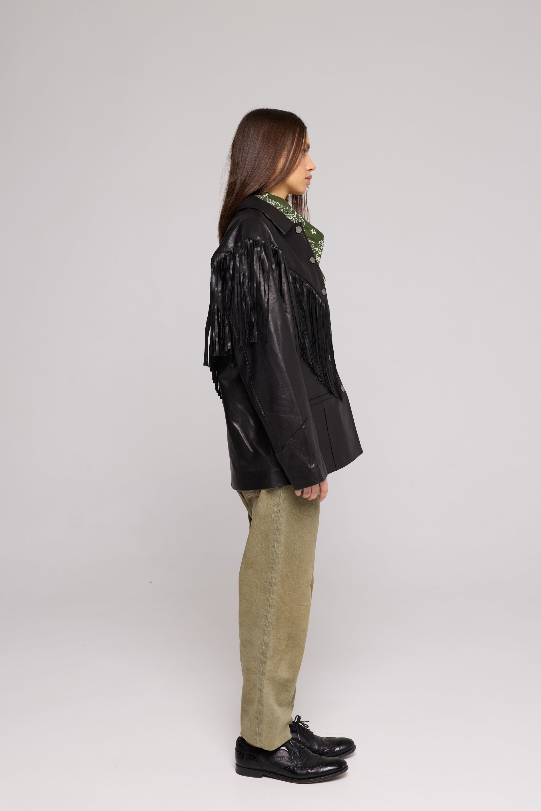 This black premium leather jacket with fringe combines structure, movement and stage presence in one piece.