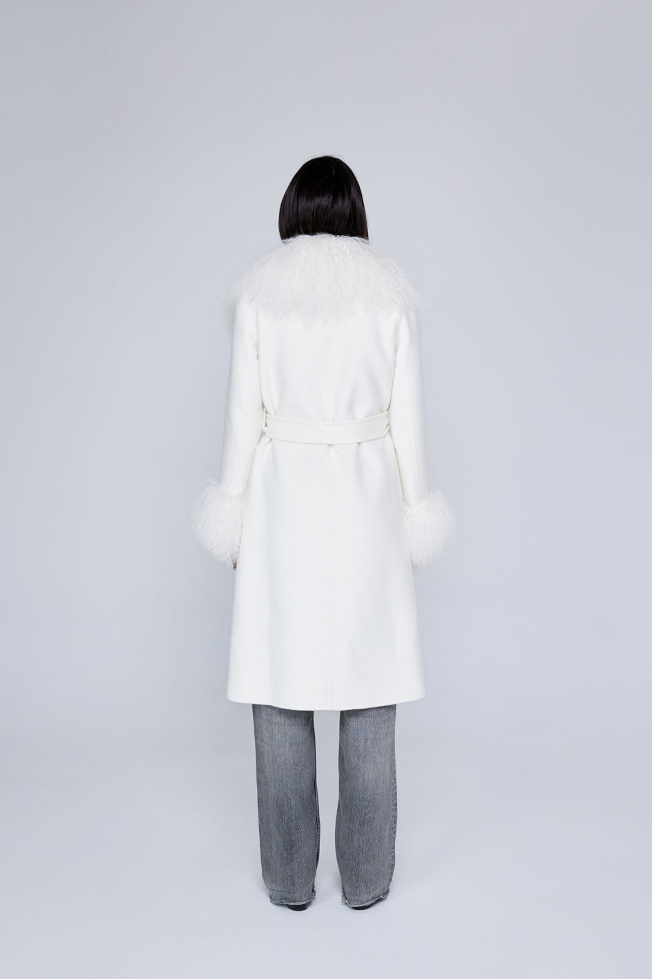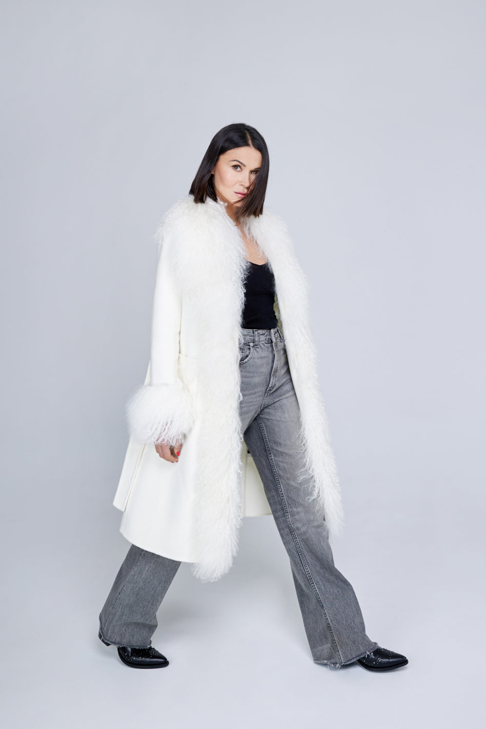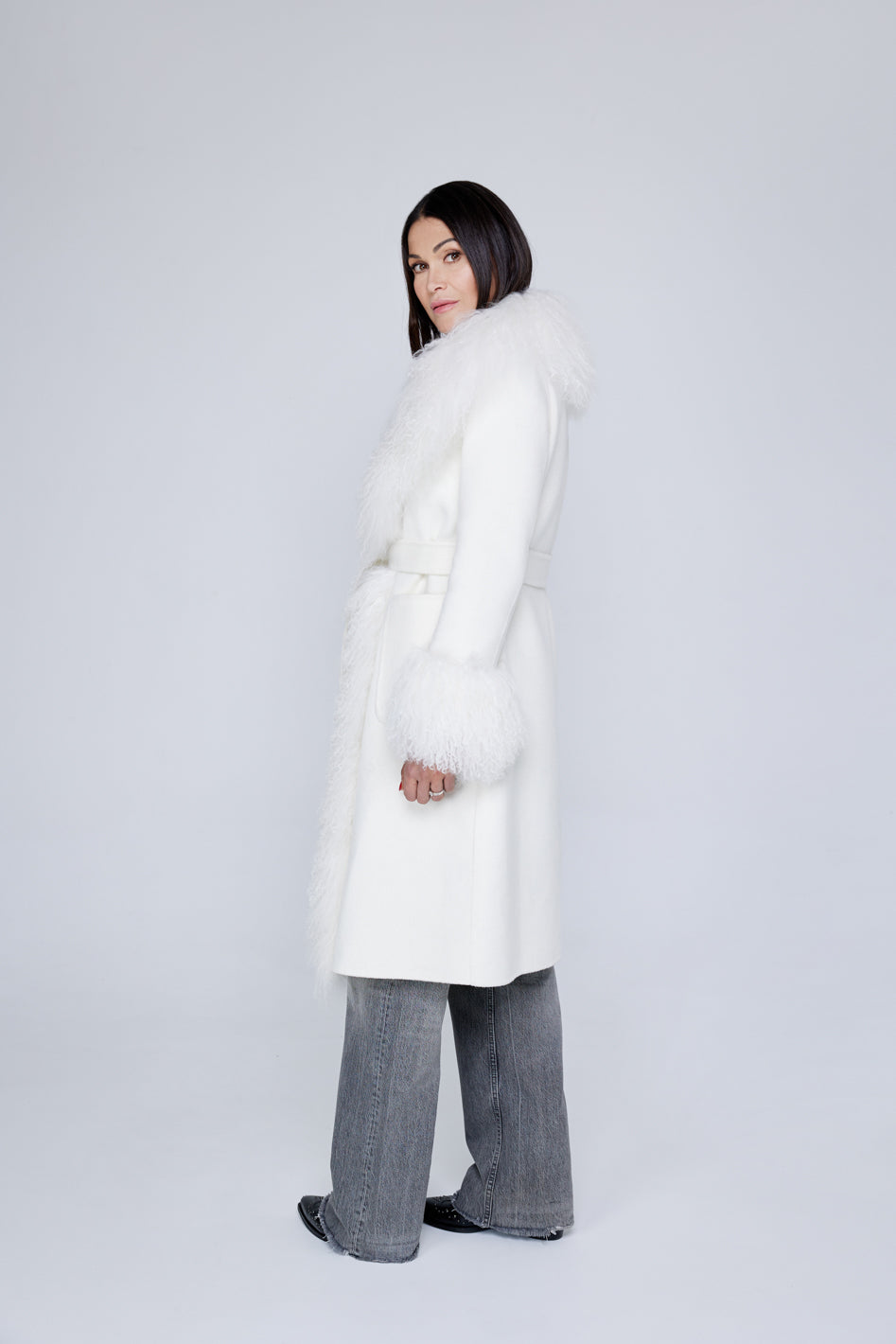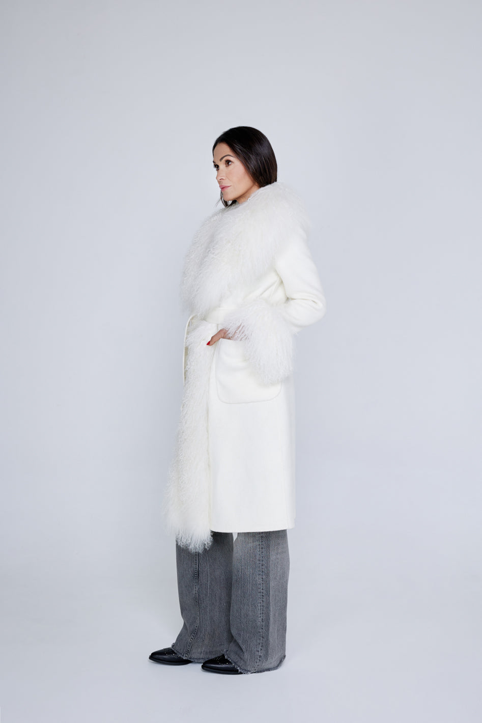 Made with the best Mongolian wool, this cashmere blend coat makes a statement wherever you go. The natural curly finish and hidden closures make this jacket as chic as it is cozy.