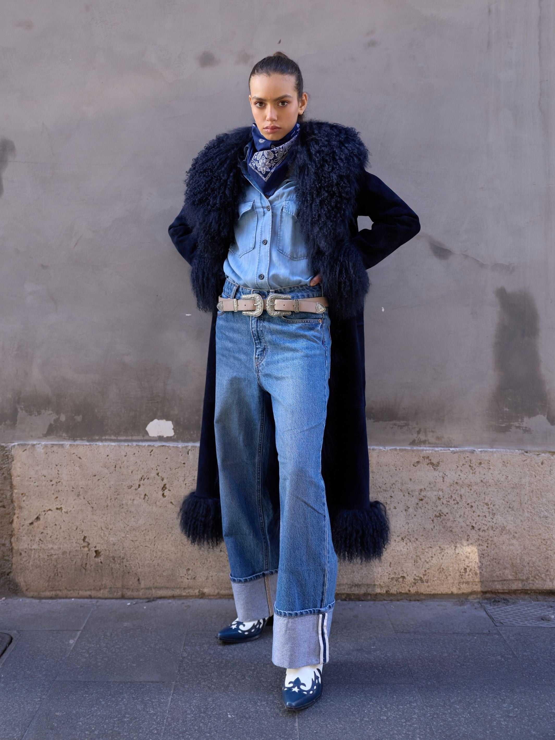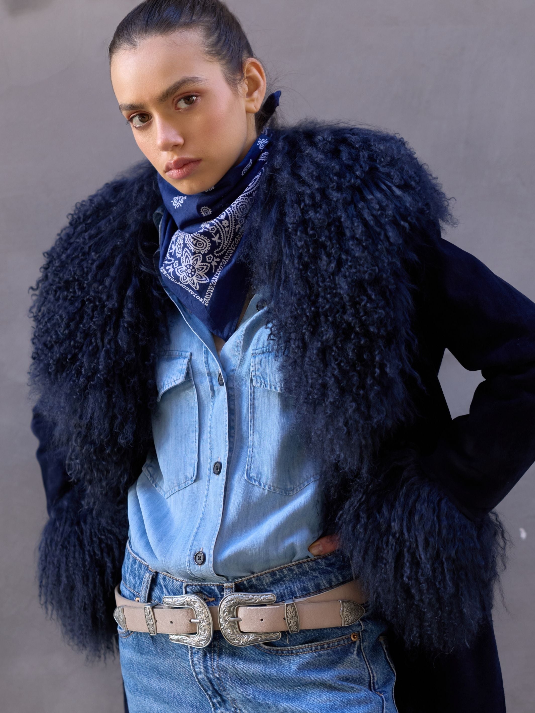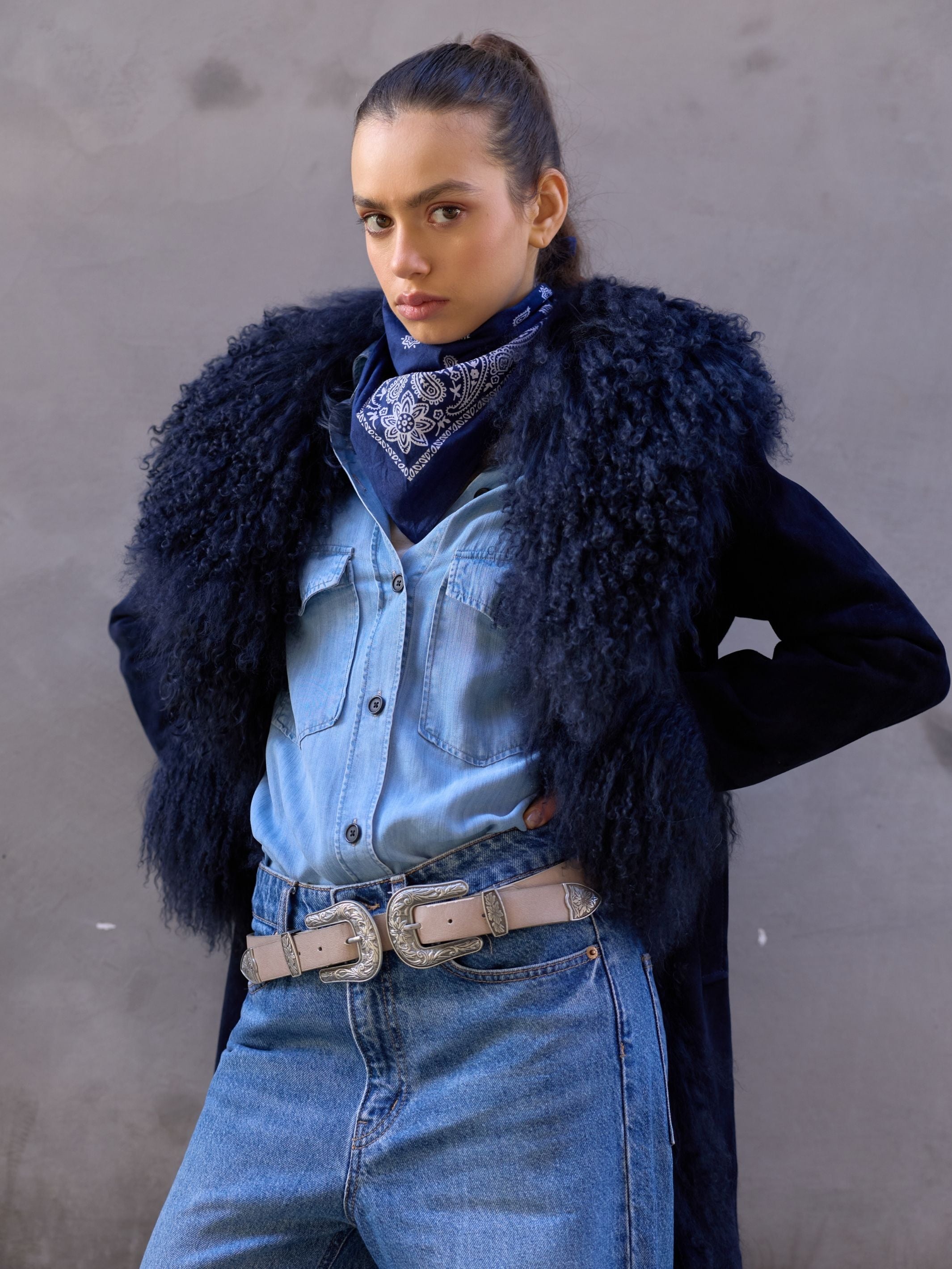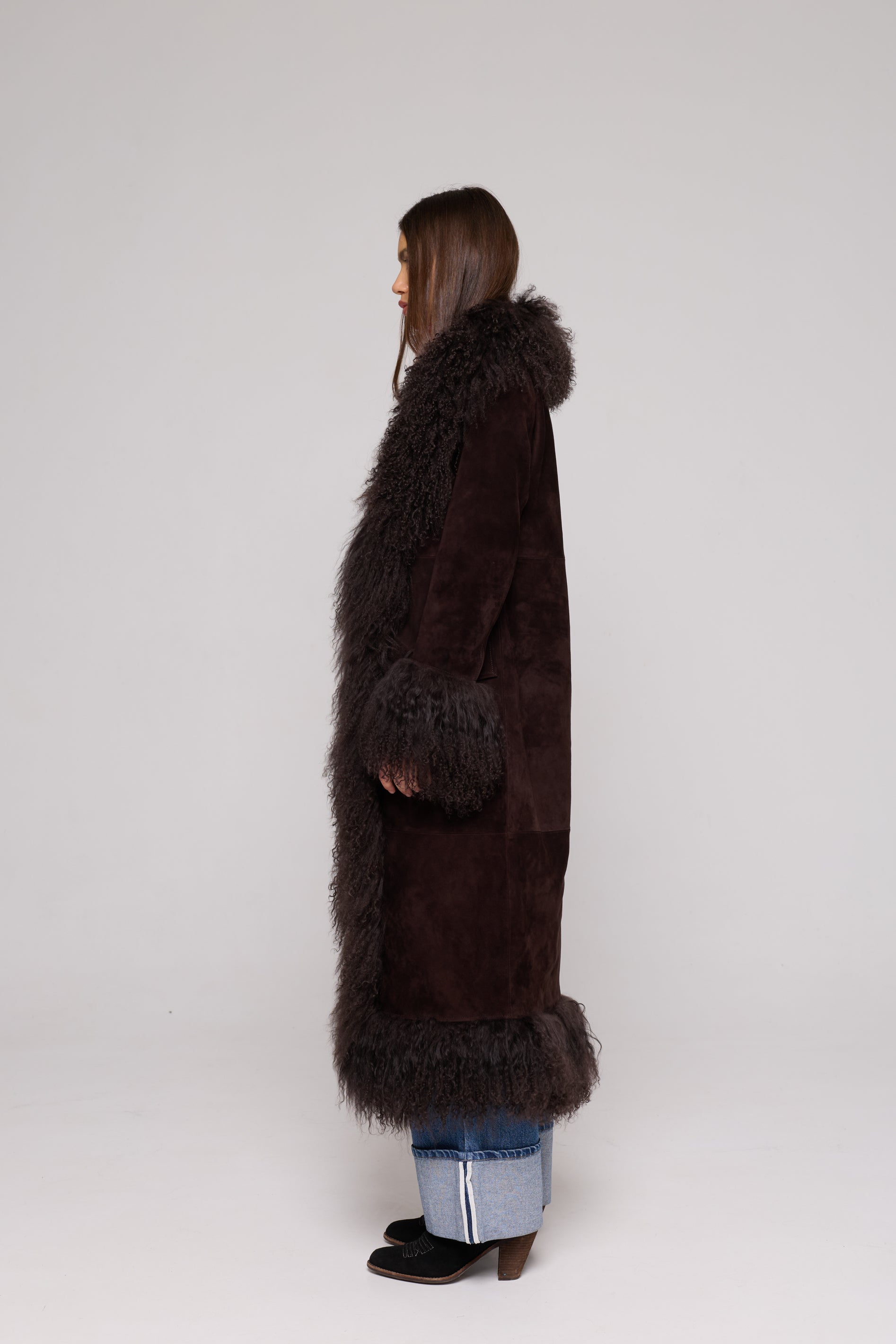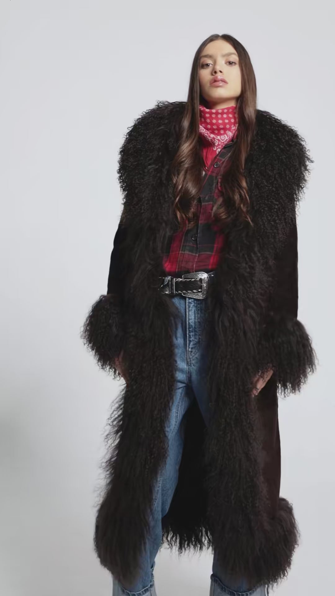 Made with the best Mongolian wool, this suede coat Make a statement wherever you go. The natural curly finish and hidden closures make this jacket as chic as it is cozy.