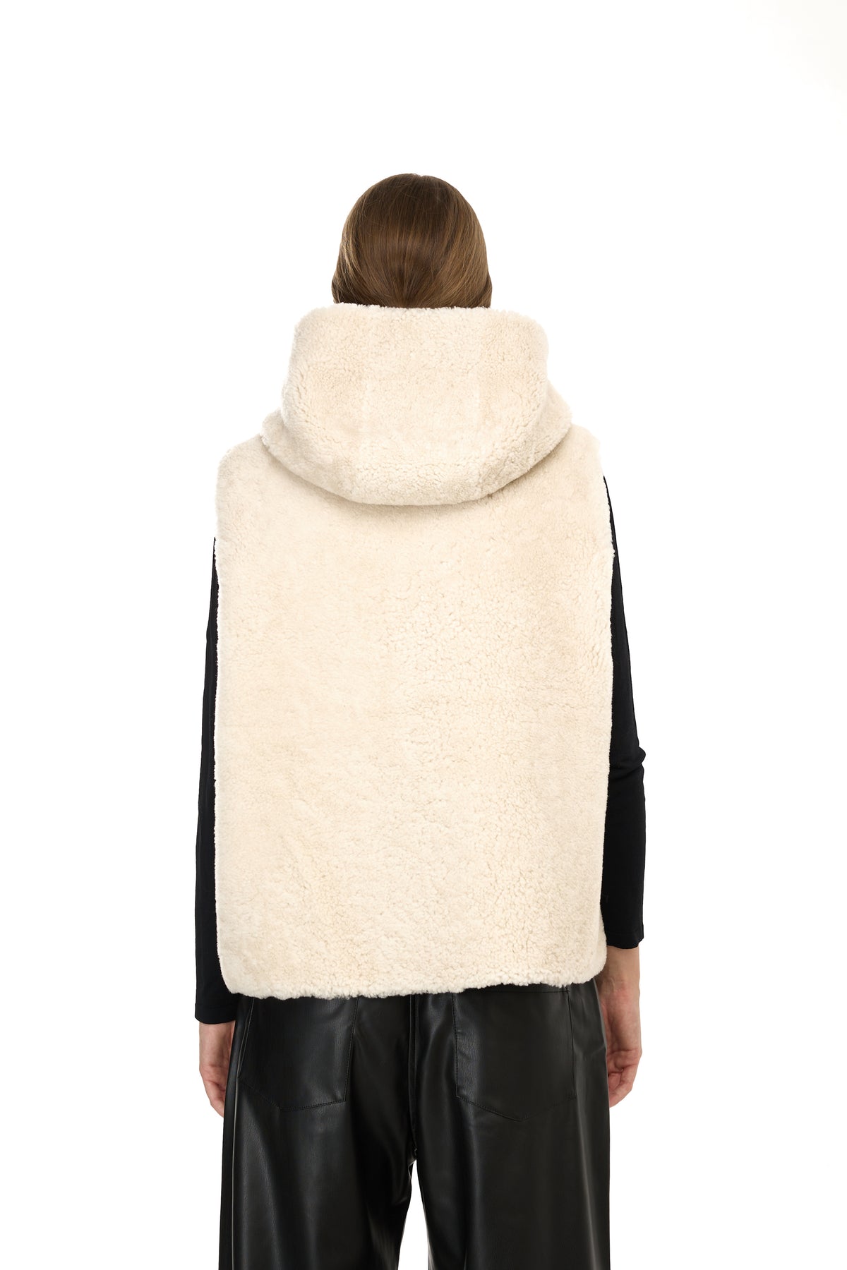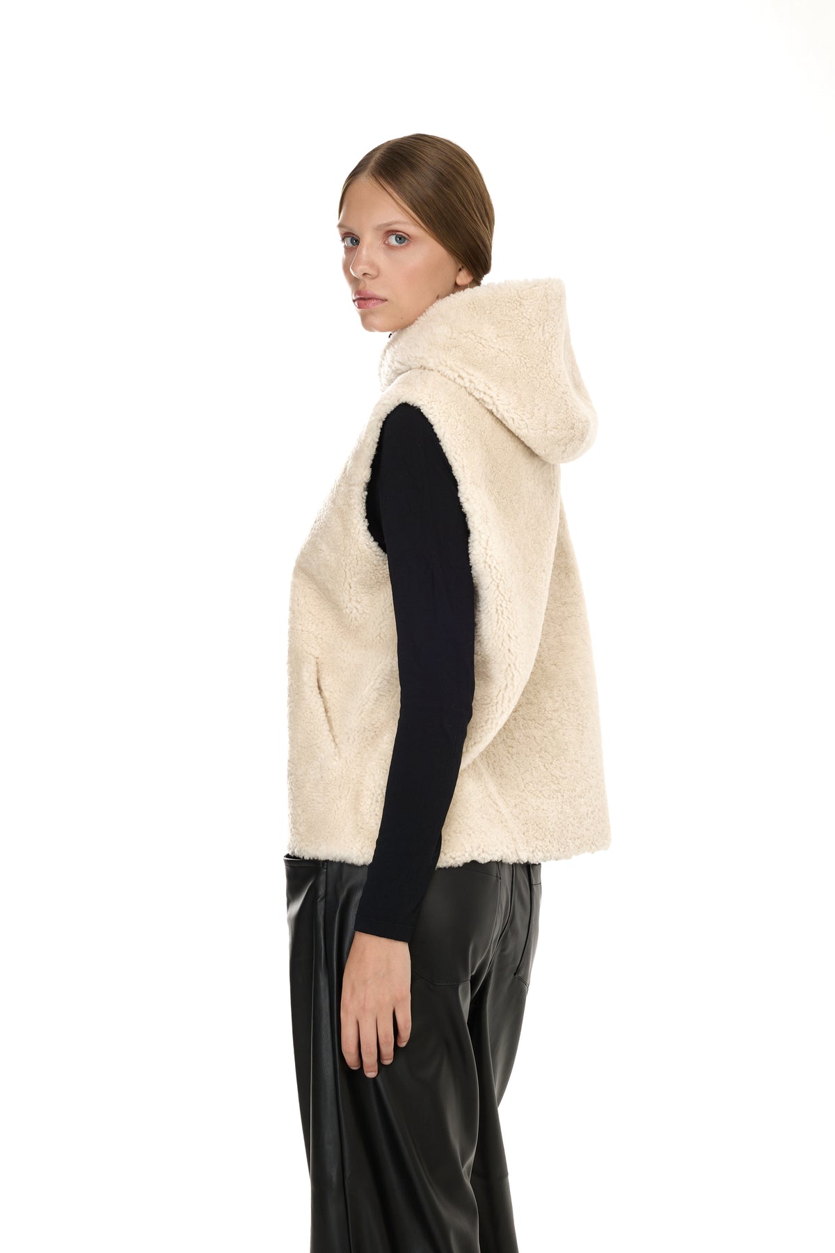 El Chaleco con capucha de cordero merino color marfil Es una pieza exclusiva de la colección Amorak Italia, elaborada con Cordero Merino Español, reconocido por su excepcional suavidad, calidez y calidad premium.