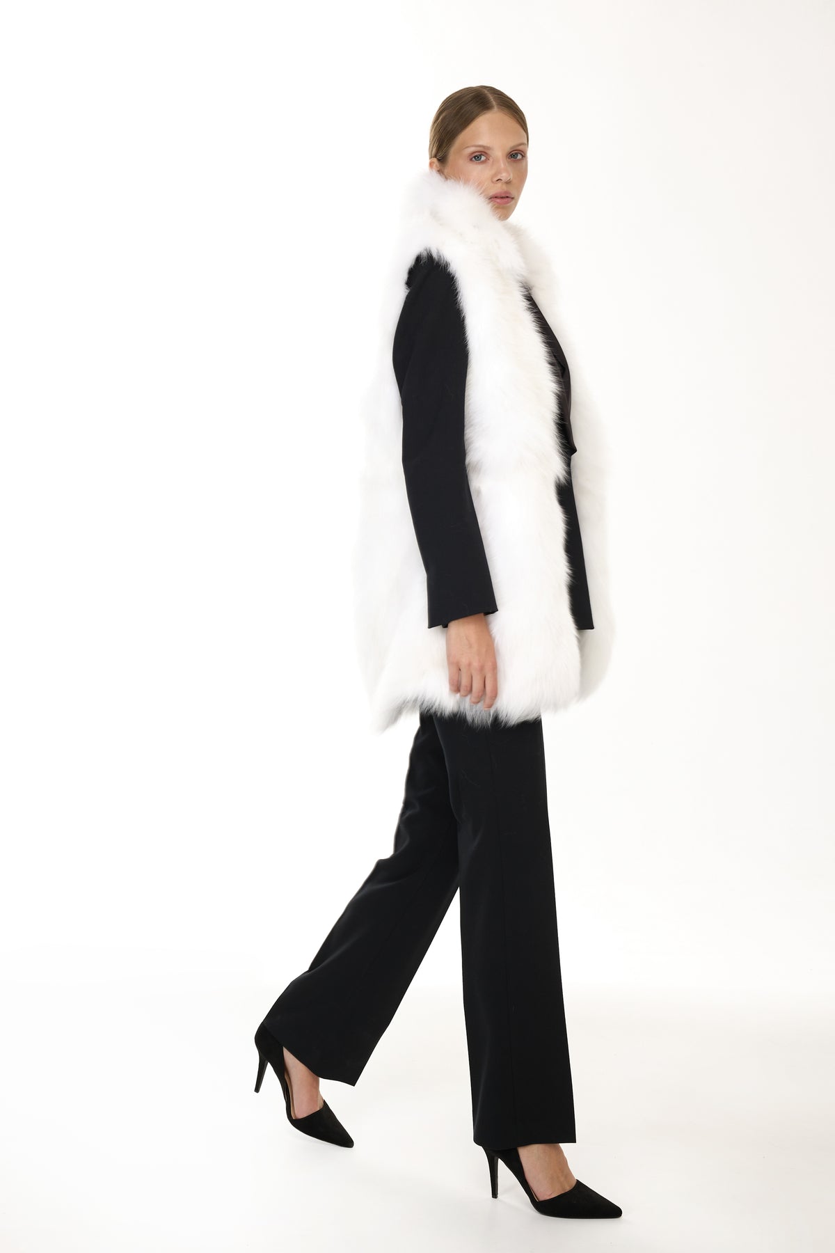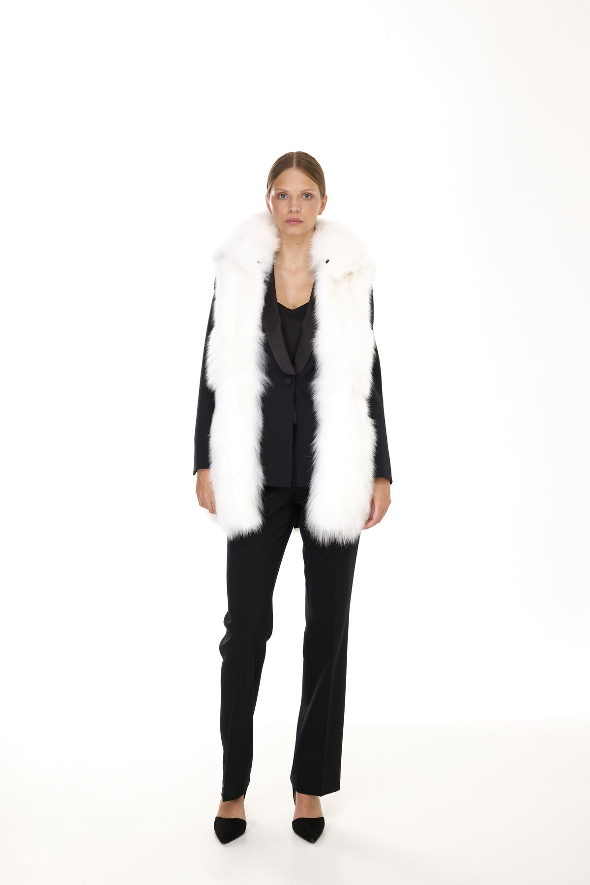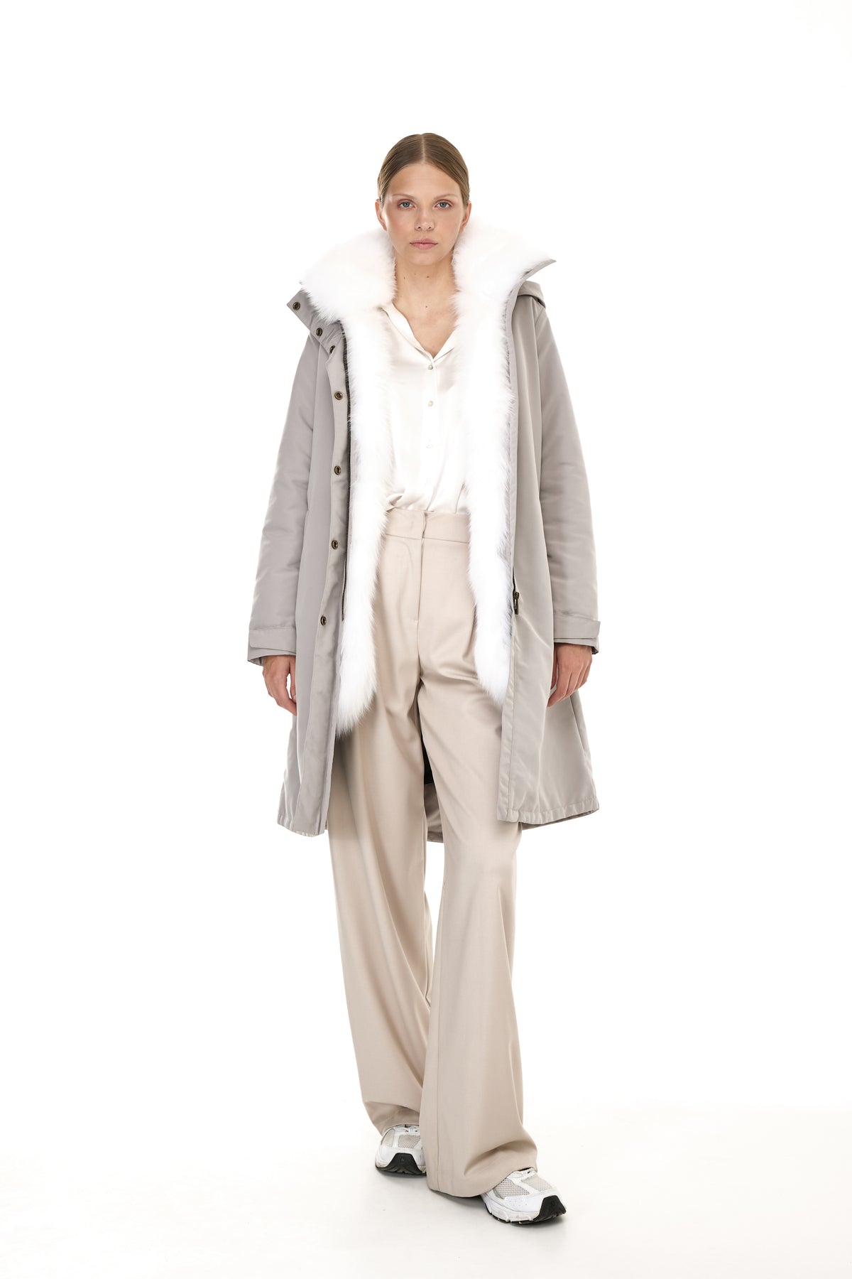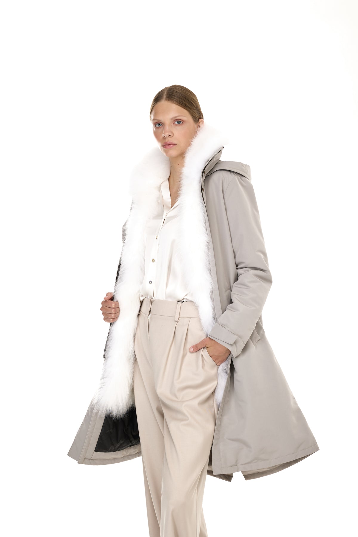Quando la pelliccia viene rimossa, la parte esterna si trasforma in un parka leggero perfetto per la primavera e le serate estive, mantenendo la sua silhouette pulita e il taglio sofisticato.