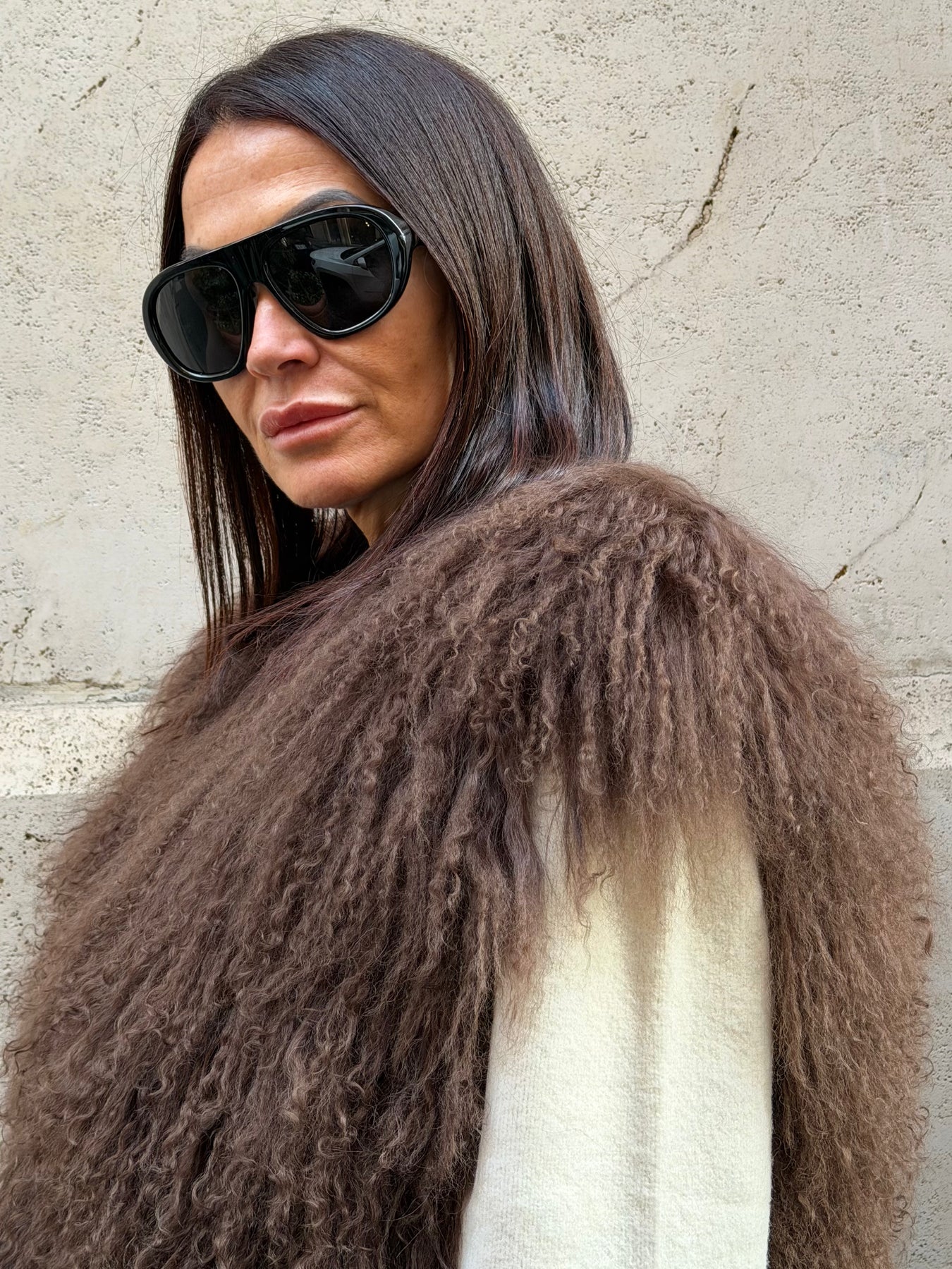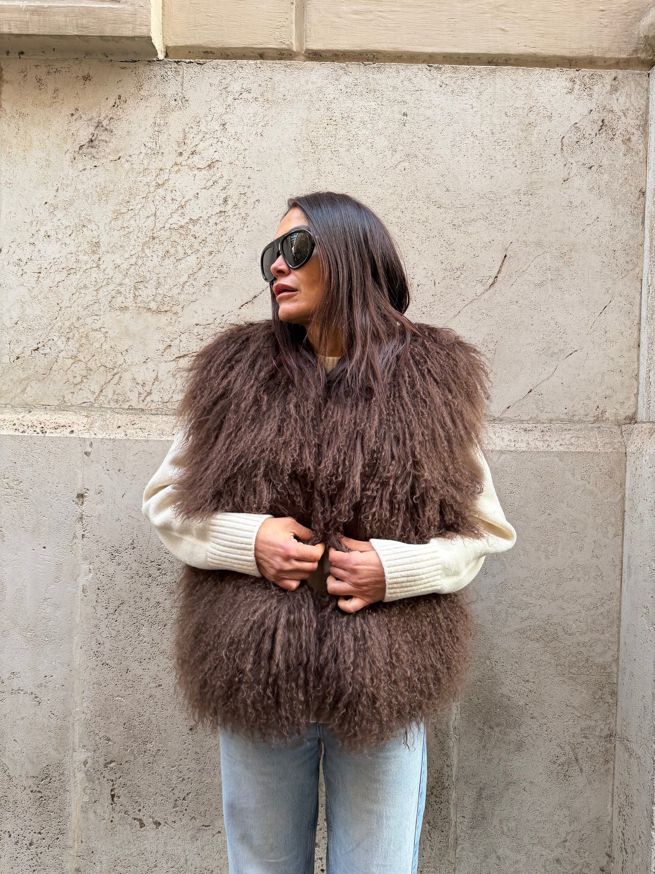 Gilet fabriqué en fourrure mongole 100% agneau de qualité supérieureChoisi pour son extraordinaire douceur et son effet ondulé et volumineux unique, ce tissu à poils longs et soyeux épouse naturellement la silhouette, lui conférant une élégance à la fois sophistiquée et contemporaine.
