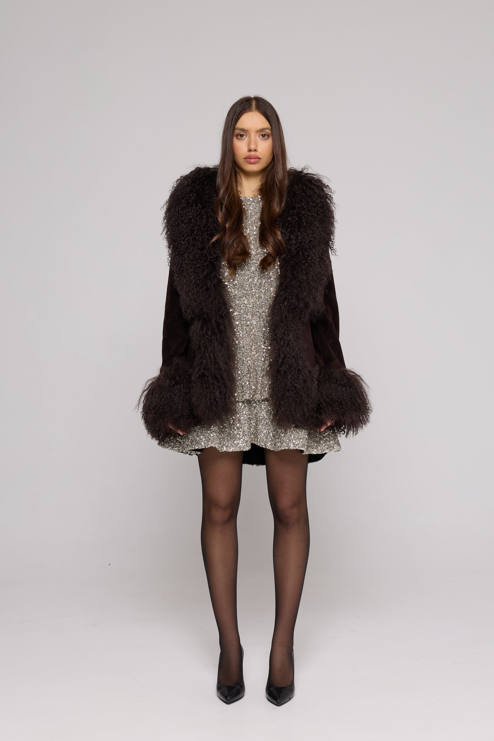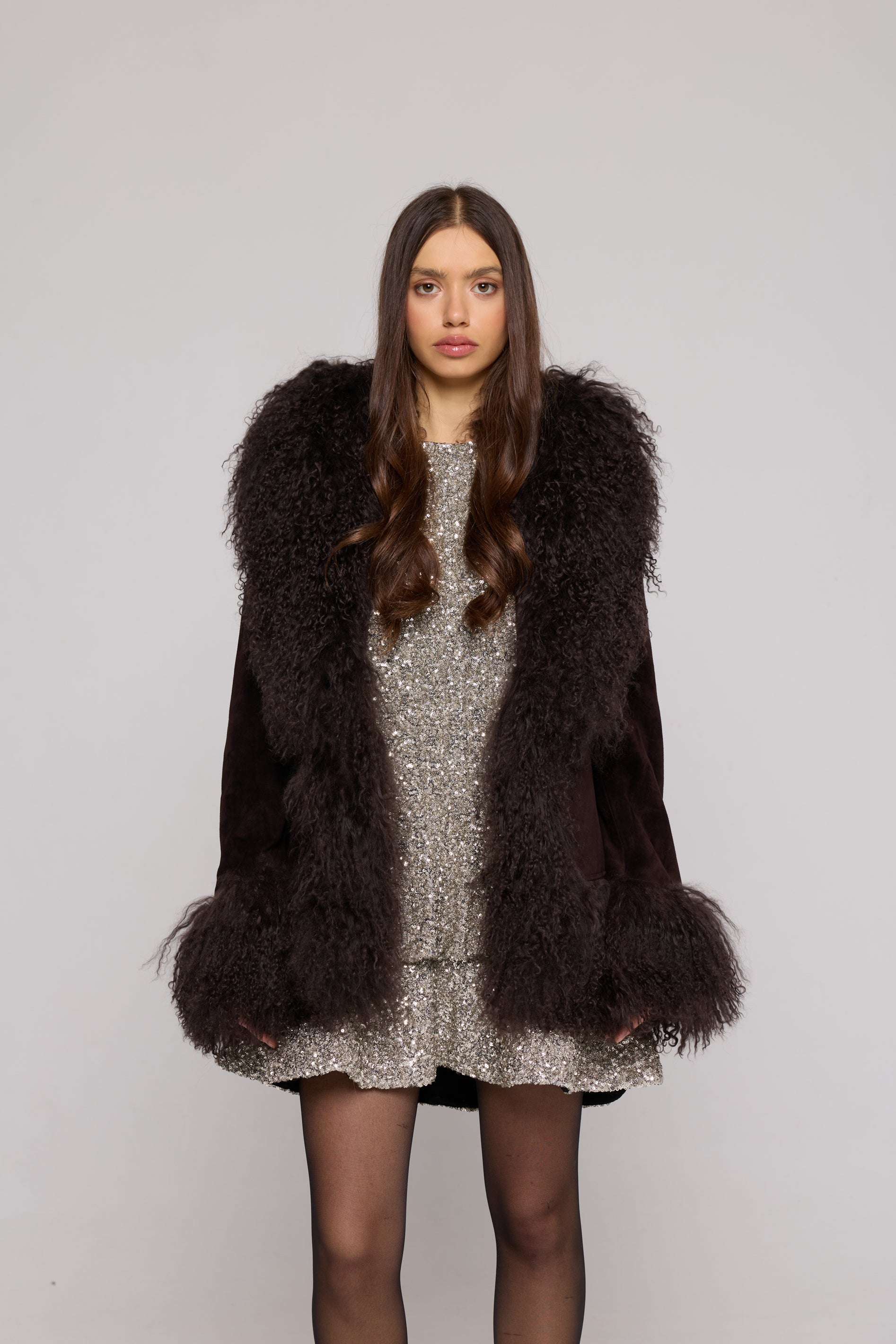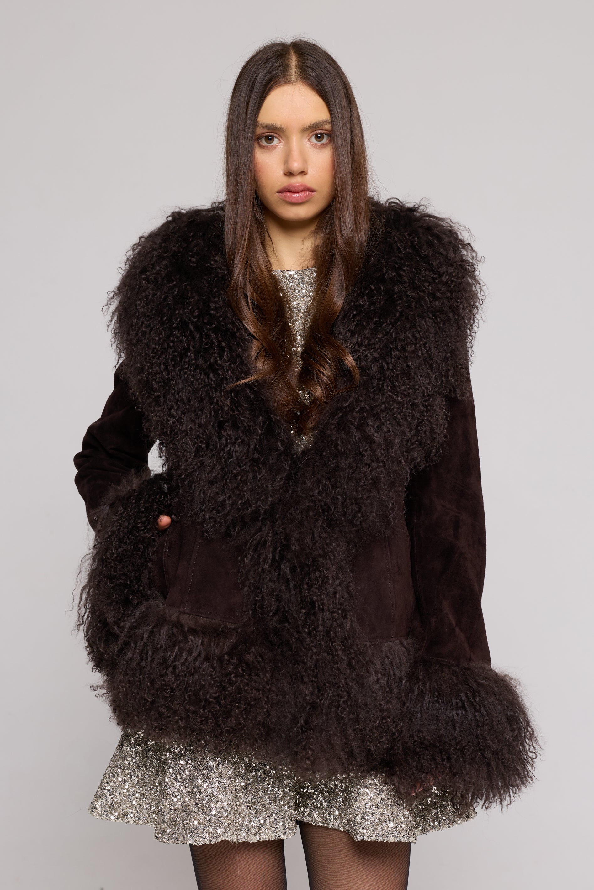 Questa giacca in camoscio e Mongolia è il perfetto mix tra lusso e versatilità. Il morbido colletto in shearling e le tasche esterne lo rendono adatto ad ogni occasione, dal vestito elegante ai jeans casual.